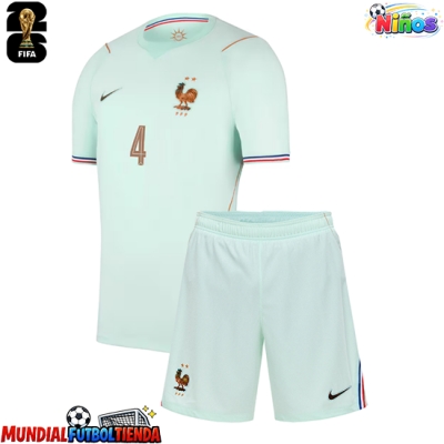 Camiseta Francia Dayot Upamecano #4 Segunda Equipación Replica Mundial 2026 para niños mangas cortas (+ Pantalones cortos)