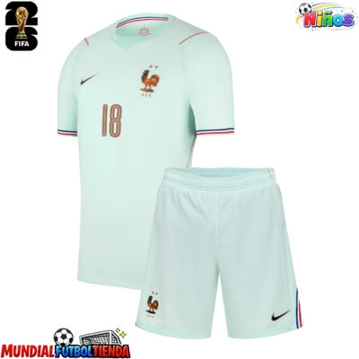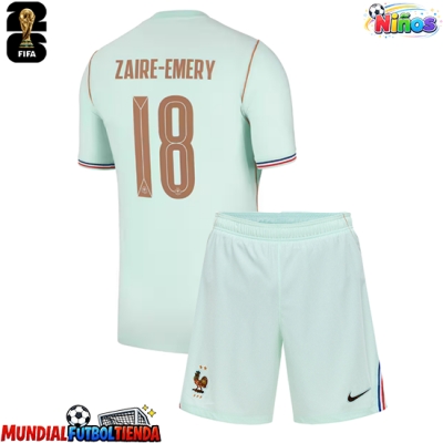 Camiseta Francia Warren Zaire-Emery #18 Segunda Equipación Replica Mundial 2026 para niños mangas cortas (+ Pantalones cortos)